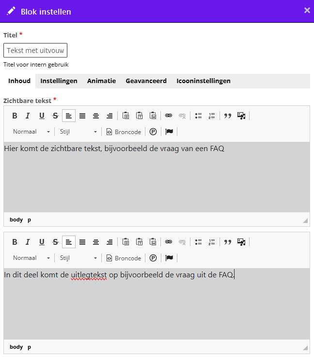 De tekst kun je opmaken met een kop, stijlen, linkjes en afbeeldingen, net zo als in een gewoon tekstblok (klik hier voor meer informatie over tekst bewerken)